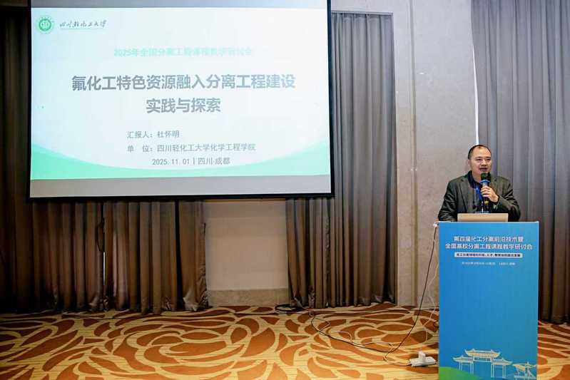 在11月1日举行的 “化工分离领域的科技、人才、教育协同融合发展” 分论坛上,杜怀明副院长以《氟化工特色资源融入分离工程建设的实践与探索》为题作报告。报告紧密结合四川轻化工大学在氟化工领域的学科优势与教学实践,系统阐述了如何将地方特色产业资源与核心课程建设深度融合:一方面,依托学校在氟化工材料研发、工艺优化等方面的科研积累,开发了 “氟化物分离工艺案例库”“氟化工虚拟仿真实验项目” 等教学资源,将行业前沿问题转化为课程教学内容;另一方面,通过建立 “校企联合教学团队”,邀请氟化工企业技术专家参与课程设计、实习指导,构建了 “理论教学 -科研训练-产业实践” 三位一体的教学体系,有效提升了学生解决复杂工程问题的能力与行业适配度。