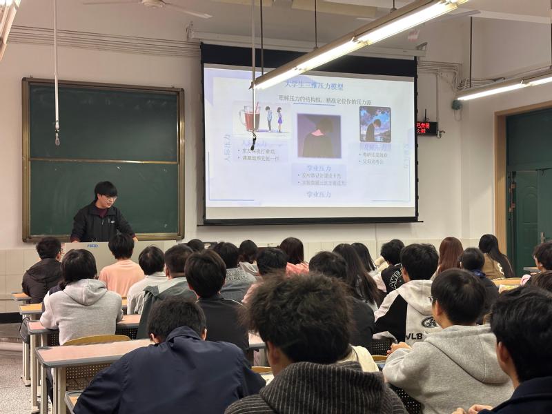黄涛学长从“学业卡壳”“人际矛盾”“发展迷茫”拆解了大学生三维压力模型,精准戳中同学们成长的痛点,并分析了情绪行为诞生的真相。黄涛同学详细讲解了ABC理论,揭示了情绪行为诞生的真相,希望同学们尝试捕捉并改写那些消极的“B句”,做好情绪管理。