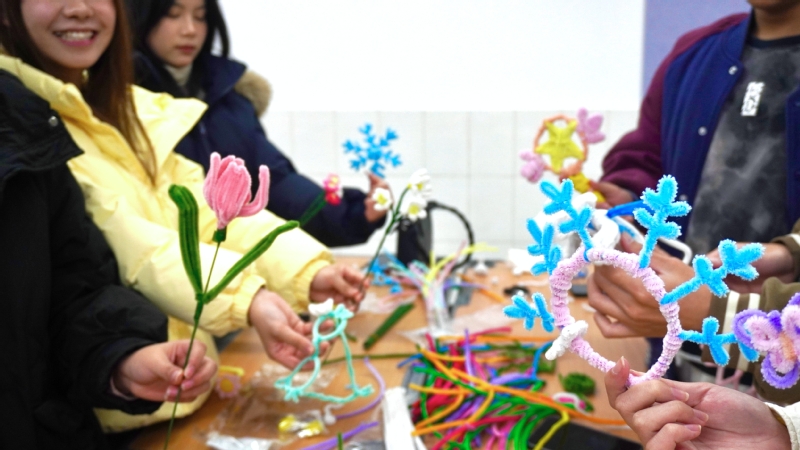 “捻缕成诗,扭韵成画”环节,则让扭扭棒焕发巧思与趣味。各色扭扭棒在指尖流转,逐渐化为灵动的小狗、鲜艳的郁金香、精巧的新年挂饰与迷你摆件。遇到造型难题时,大家互相支招、分享技巧,在协作中不仅创造出鲜活的作品,也收获了轻松的愉悦。