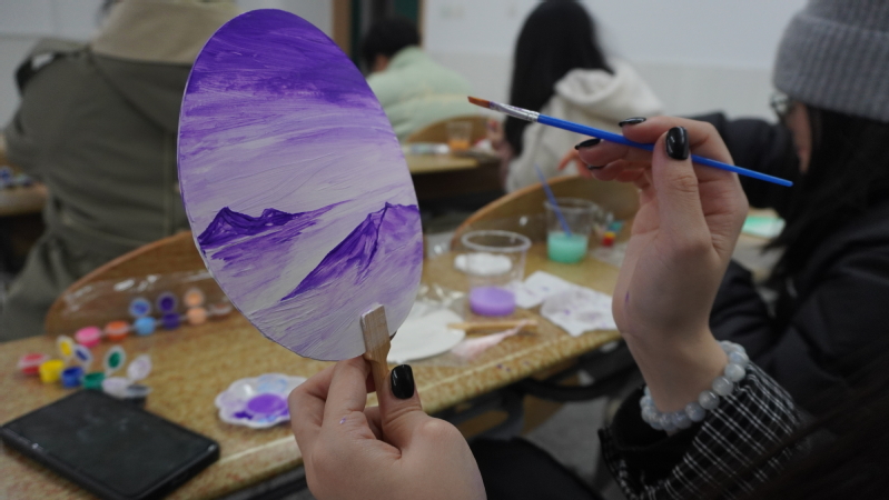 “扇绘清欢,笔抒己心”环节,空白团扇在同学们手中渐渐被赋予生命。有人以白紫晕染出山间静谧,有人绘就可爱卡通形象,使扇面洋溢童趣。不拘章法,笔随意动,每一把团扇都成为独一无二的“情绪载体”。
