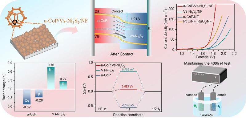 电催化作为一种新兴的催化技术,被广泛应用于全解水产氢、二氧化碳还原、氮还原反应等能源转换与存储领域。然而,现有的报道表明CoP基电催化剂具有本征活性低、稳定性差和微观机制不清晰等问题,严重制约商业化应用。本工作围绕高效的催化剂开发,设计并开发了一种新型非晶-晶体电极材料(a-CoP/Vs-Ni3S2),通过p-n结和缺陷工程策略增强了材料电化学活性和稳定性。在氢气和氧气析出反应中,具有超低的过电位。对于整体水分解,该电极仅需1.58 V的低电压即可达到10 mA cm−2的电流密度,并在400小时内维持优异的稳定性,其性能超过了报道的大多数催化材料。此外,结合密度泛函理论(DFT)计算证明了a-CoP/Vs-Ni3S2的p-n结增强了电荷动力学,优化了d带中心,加速了中间体的吸附和脱附动态过程,并降低了反应能量势垒,特别是对于活性氢(*H)和关键含氧中间体(*OH、*O和*OOH)。此外,这种策略改善了C-P键的抗氧化性,从而同时增强了催化活性和结构稳定性。本研究展示了一种开发高效且稳定的全解水电极材料的新方法,为设计高效稳定的催化剂提供了新思路。