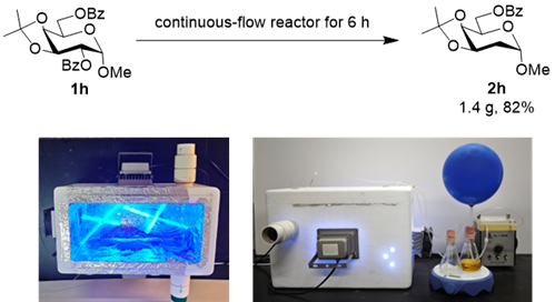 实验表明,该体系对多种单糖及二糖底物均适用,分离产率达76%以上,且具有优异的官能团耐受性。进一步克级反应采用自己搭建的连续流反应器,将时间缩短至6小时,产率提升至82%,展现出良好的工业应用前景。